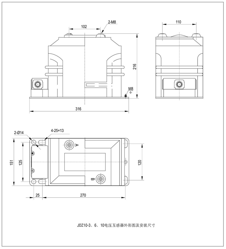 | 本系列電壓互感器為支柱式結(jié)構(gòu),采用環(huán)氧樹脂全封閉環(huán)氧澆注,耐污染及潮濕,也適用于熱帶地區(qū)使用,互感器不需要特別維護(hù),只需定期地清除表面污物?;ジ衅鞫纬鼍€端子處安裝接線端子盒,端子盒正面和側(cè)面各有一個孔與出線端配合供引出接線用,安全可靠。產(chǎn)品底板上有接地螺栓及供安裝用的六個安裝孔。 | ||||||||||||||||||||||||||||||